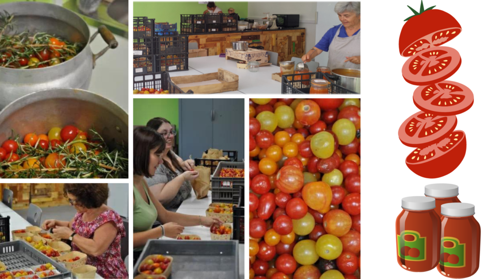 Atelier tri des tomates puis transformation, il a bien fallu 5 bénévoles pour réaliser une quarantaine de litres de sauce tomate, qui ont fait des heureux lors de la vente en début d’année 2023.